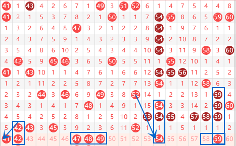 本期的41 44 47我们要注意一下,已经遗漏3期了,本期应该是要出号了,我们重点关注一下41 47号数字的出号情况。连号空一带号42 43 45我们也是要注意出重号的情况的。本期的48 49号数字我们也是要关注一下,防守一下47 48 49出现三连号的情况。三连号53 54 55和三连号57 58 59上期都没能出现重号,本期我们要注意一下回补的情况,重点关注一下54 58 59号数字的出号情况,这里有可能会出现两个号码,我们要重点关注一下。