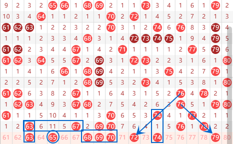 上期开出了63号数字,本期我们要注意走重的情况,61 62都出重号,本期有可能就到63了,所以我们可以关注一下。连号空一带号67 69 70本期我们要注意一下夹号68号数字的出号情况,当然出重的情况我们也是要防守的,重点考虑一下68 70号数字的出号情况。本期的72号数字我们可以关注一下,它是属于三斜连号码,出号机会还是有的。本期的79号数字我们也是要注意一下的,它是属于122走势,出号机会还是有的。