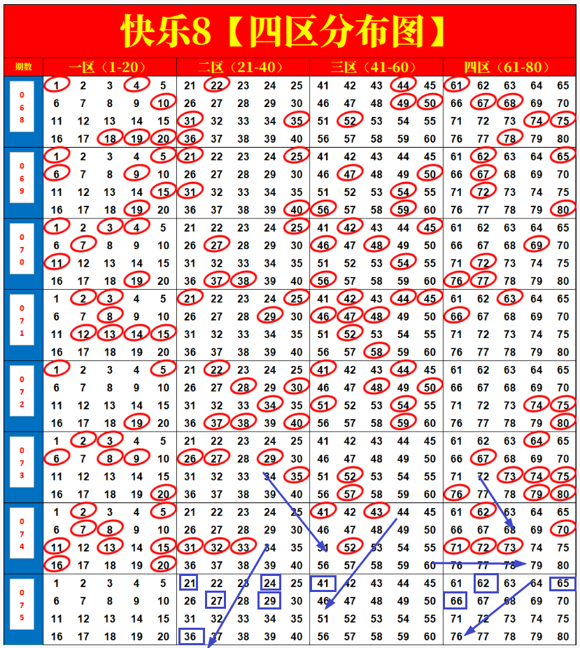 对于快乐8的选号,我着重从四个方面下手,分别是历史同期开奖结果走势、热尾号、四个区间走势。
