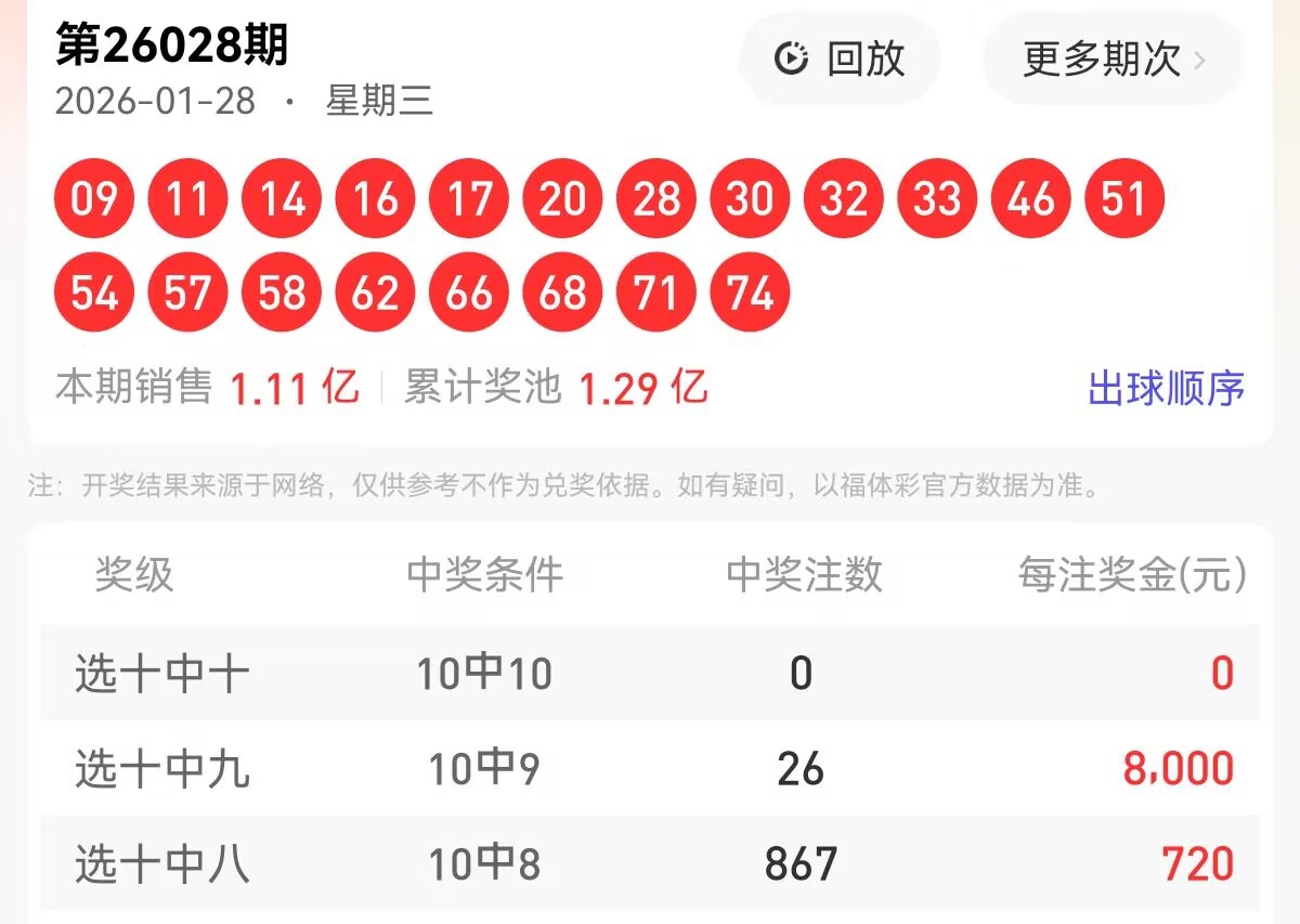 上期福彩快乐8第 2026028期开奖号码为【09 11 14 16 17 20 28 30 32 33 46 51 54 57 58 62 66 68 71 74】,其中大小比10:10,奇偶比为7:13,和值为817,跨度65,四区间比为6:4:5:5。下面是对本期对于每个号码的详细分析。