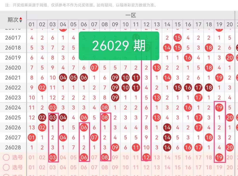 上期第一区间开奖6个号码,本期可能会减少开出。03是区间前端低位奇数,能补足区间头部的号码空缺,拉开区间跨度。06、08、12三枚偶数连续排布,数值温和且衔接顺畅,能形成稳定的中间支撑,避免选号过于分散或扎堆。19是区间尾部高位奇数,和前端03形成奇偶首尾呼应,平衡一区整体奇偶比例,同时守住区间尾端点位。