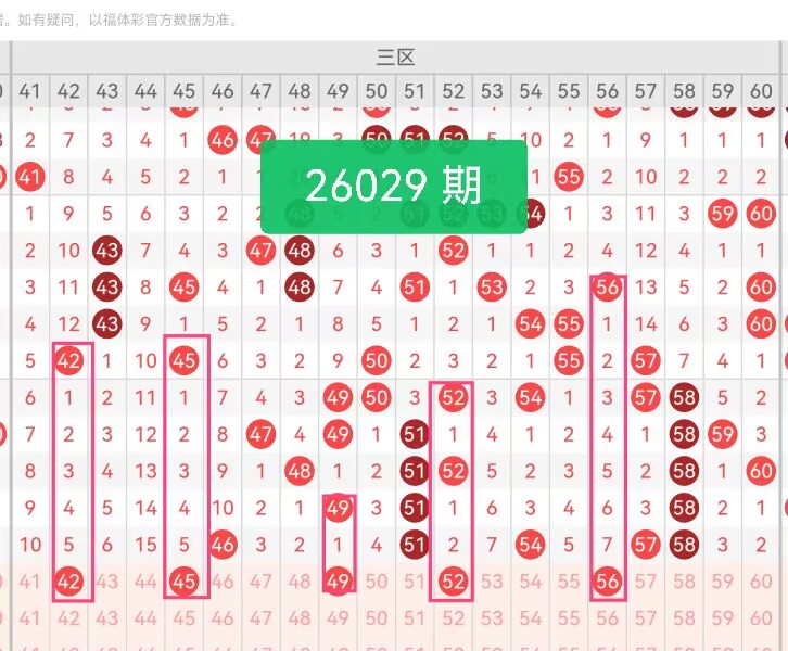 上期第三区间开奖5个号码,本期可能会稳定开出。42作为三区起始偶数,走势延续性强,和上期三区开出号码形成温和呼应,保持区间活跃度的平稳衔接。45、49两枚奇数居中排布,点位间隔均匀,填补三区中段奇数空缺,让区间奇偶分布更均衡。52、56两枚偶数位于三区后半段,数值相近且走势温和,彼此联动性强,既能延续三区偶数的平稳节奏,又能守住区间后半段关键点位,和前端42形成完整的偶数链条。