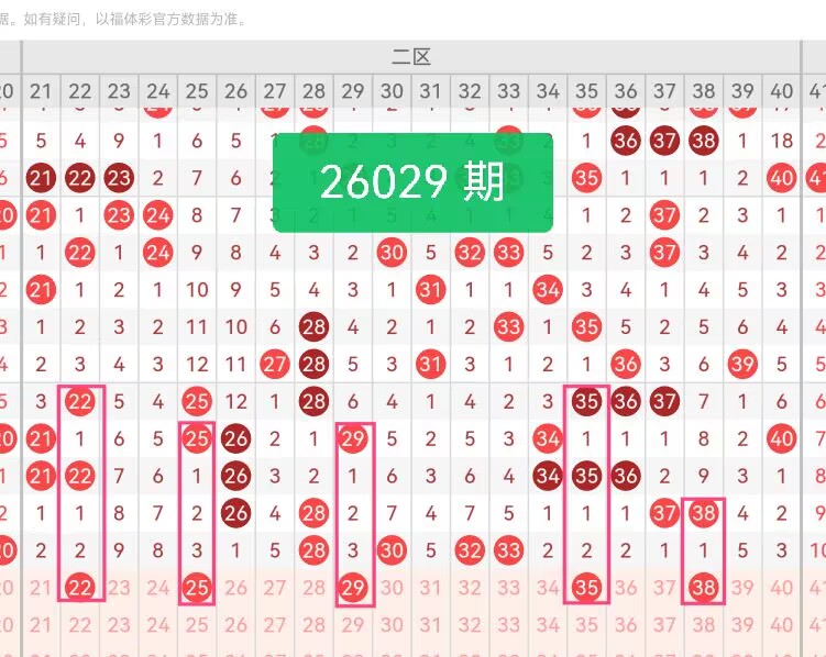 上期第二区间开奖4个号码,本期可能会增加开出。22作为二区起始段偶数,走势平缓且承接一区偶数的节奏,保持全场偶数走势的连贯性。25、29两枚奇数依次排布,位于二区中段偏前位置,点位间距适中,形成奇数联动。35是二区中段核心奇数,处于区间中心点位,起到承前启后的衔接作用,让前后号码走势连贯不脱节。38是二区尾部偶数,靠近三区分界处,前端22形成偶数首尾呼应。