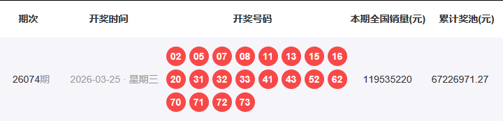1、开奖号码:02 05 07 08 11 13 15 16 20 31 32 33 41 43 52 62 70 71 72 73