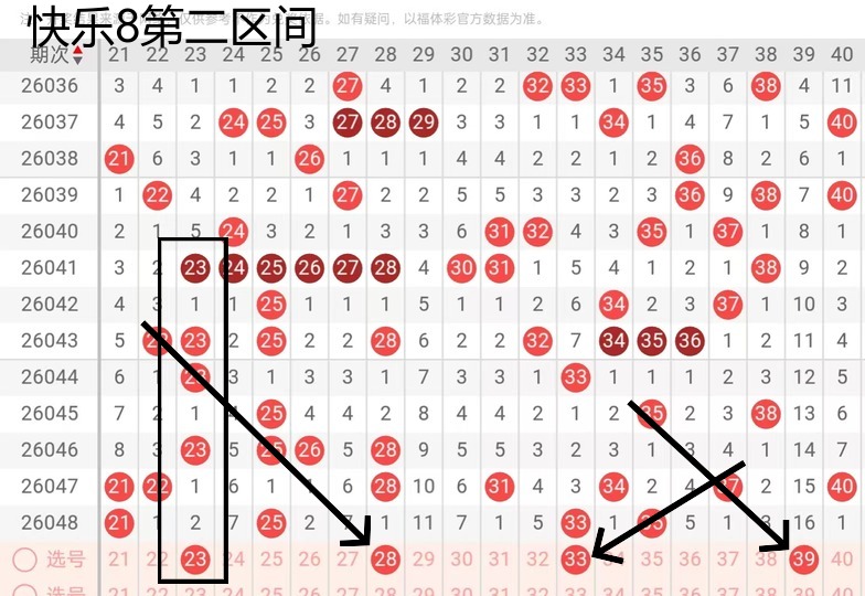 第二区间23这个位置的话,还是考虑有一个反向走势的一个一个位置,28这个号码的话,也是走到了一个201的走势,还是可以考虑的,33号考虑重,因为这个号码的话,还是看到有重的可能性,那么39号这个16期的隔期号还是要考虑的。