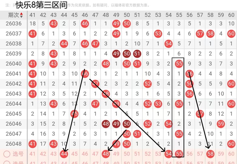 第三区间44号,这个号码的话也是考虑是今天第三区间的一个龙头的位置,然后48号这个位置的话,考虑到一个编码的一个号码,54,55这两个号码的话,本期考虑会落到一个号码的样子,那么58号这个号码也是考虑有落号的可能性。