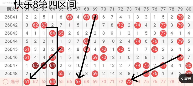 第四区间61号,这个位置的话也是考虑到一个斜连号的,一个遗漏的走势,那么64号也是走到了一个201的走势,也是可以考虑有落的可能性,那么67号这个位置的话,我还是考虑有落号的可能性,因为它跟23号很配,73号这个位置也是考虑到一个奇数斜连的一个走势。