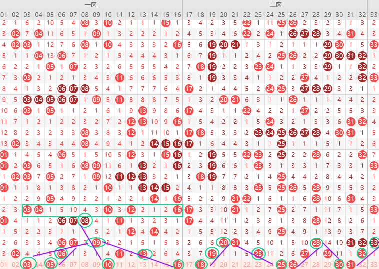 本期一区胆尾3尾1尾6尾,边号1 3 5 7 10 12 14出一码,重号2 6 11 13出一码,一区呈走热趋势,本期大概率出3-5码,形态上3 5 10 16是斜连号,上图已勾画,短期规律隔5期号出2期,本期只有5是隔5期号,可以关注,其次遗漏值3 4 10 16有一码,6尾最热出2期本期先看16,上图已勾画,重号11 13二出一,结论关注五码3 5 11 13 16防12