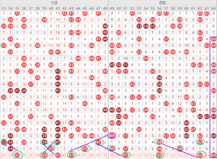三区胆尾1尾9尾6尾,上上期预判上期走冷开3码,预判正确开出3码,走冷趋势,本期大概率2-4码,边号33 35 39 41 44 46出一码,重号34 40 45出一码,形态上35 39 41 43是斜连号,上图已勾画,这个区最爱出斜连号,本期35 39 41出一码,本期遗漏值43 46二出一,结论关注五码35 39 41 43 46