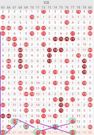 五区胆尾8尾2尾,边号65 67 68 70 73 75 79出一码,重号66 69 74 80出一码,形态上65 71 77是斜连号,上图已勾画,71是正点位,更倾向它的边号70 72出一码,重号断2期本期加大出号概率,看好66 74二出一,冷号还是要防守78,结论关注五码65 66 74 72 79
