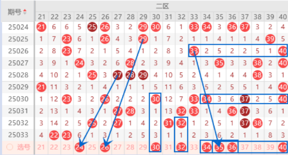 上期开出了20 22 23号数字的连号空一带号,本期我们防守一下出一个重号的情况。本期的24 26号数字我们注意出一个号码的情况,都是属于斜四连号,出一个号码的机会是很大的。本期的25 27 31 32 37 38号数字都是属于遗漏1期的号码,本期我们要注意出号情况,其中的32 37号数字我们可以重点关注一下。本期的35号数字是属于斜连号码,本期可以防守一下35 40号数字同出的情况。