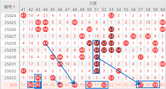 该区间上期开出了43 45号数字,本期我们注意一下走一个重号和一个分边的情况,重号注意一下43号数字,边号注意一下46号数字的出号情况,这里可以防守一下42 43号数字同出的情况,或者46 48号数字同出的情况。本期的50 51 52号数字是属于重号51号数字的边号回补号码,本期我们也是要注意出一个号码的情况,其中的50 52号数字我们可以重点关注一下出一个号码的情况。本期的59号数字是属于空四对称,是有机会出号的,我们可以关注一下。