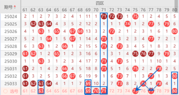 该区间上期开出了61 62 63 64号数字的四连号,本期我们要注意出重号的情况,其中的63 64号数字可以重点关注一下出重号的情况。上期的最大冷号69号数字开出来了,本期我们防守一下出重号的情况,本期的71号数字是属于212走势,出号机会也是有的,所以这里我们可以防守一下69 71号数字同出的情况。本期的75号数字是属于斜四连号,出号机会是有的,我们可以关注一下,本期的80号数字是属于连带关系号码,本期出号机会也是有的,所以这里我们可以防守一下75 80号数字同出的情况。