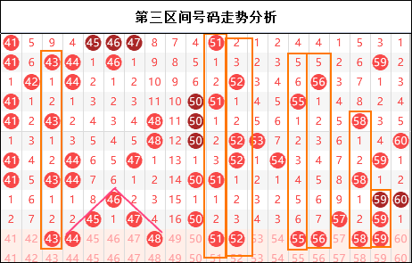 第三区间思路:三区虽然开奖号码不多,但绝对是走势上形态上周期上出现最全的区间,重号,隔期回补,分边走势应有尽有。所以三区本期给人的错觉可能一上来就是重号的选择赫斜连持续下行,但是在整体的我们可以看到,在经历了小断区之后,三区开始走势上并没有与前期有啥区别,依然是一个稀稀拉拉的走势,也就是说三区可能还要酝酿一阵子才会出现霸气的姿态,就像四区一样,在经历了前期的煎熬之后昨晚出现的六连号,瞬间就可以笑傲江湖了。