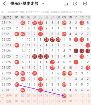 第二区,15 23 30 39 42 44 55 59 65 66 69 80,共计12个号码。上期出了1个,本期看好65码。