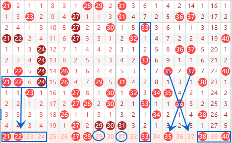 本期的21 22 23 24我们要注意出连号的情况了,已经追了2期了,本期应该要出号了。上期开出了2组三连号,那么本期我们要注意有一组落重号的可能了。本期的29 30 31落重号的情况我们就做防守,主看后面的三连号落重号就可以了。本期的33号是属于232走势,也是要关注的。35 37是属于中心对称,本期我们要防守落号的情况。