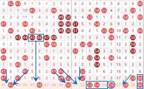 本期的42号数字和51号数字是同种类型,我们要注意开出号码的情况了。连号45 46已经遗漏6期了,本期的46走势情况很好,我们要注意落号情况。上期开出了52的重号,那么本期我们就要注意53 54的出号情况了。上期开出了59 60的重号,那么本期我们就要注意落重号的情况了。