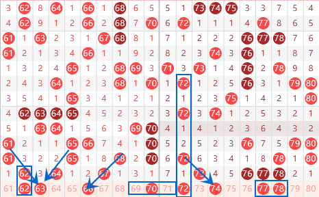 该区间的63号我们可以关注一下,好久都没有出过这种类型的号码了,本期是否会开出来,我们要做好防守。上期开出了72 73这种2斜连,本期我们要注意一下72 74的出号情况。三连号76 77 78我们也是要注意落重号的情况的,重点关注77号数字出重号的情况。