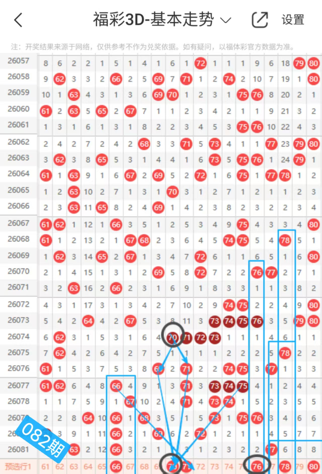 76号:这个号码本期是自身跳格对称下落的走势的,顺延77号对称下落的走势的。