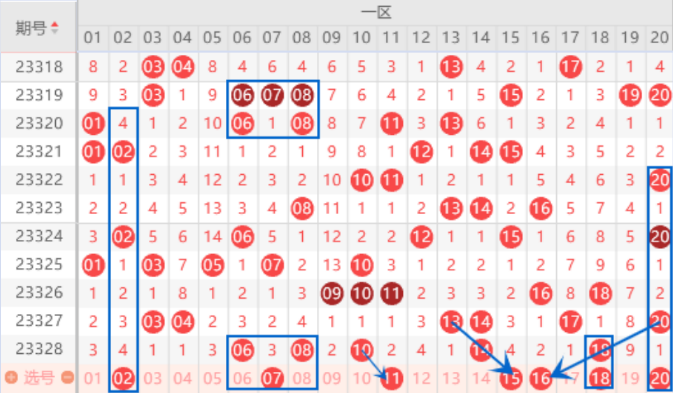 该区间的02号数字我们注意一下出号情况,前期03 04出来了,没有带01 02,那么本期的01 02应该就会出一个号码了,我们要注意一下。上期开出了06 08 10号数字,本期我们要注意一下出一个重号和一个夹号的情况。重号关注一下06号数字出重的情况,夹号重点关注一下07号数字防守一下09号数字。上期开出了10号数字,本期我们注意11号数字的出号情况,有机会带出来的。本期的12 16号数字都是空三中心号,本期有机会出一个号码的,我们要重点关注一下。