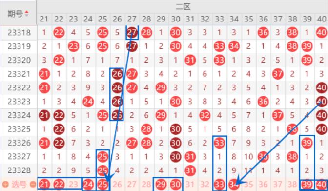 该区间的21 22 23号数字我们要注意一下,这里应该会出一个号码。本期的25号数字我们要注意一下出三重的情况,防守一下24 25同出的情况。本期的29 30号数字我们也要关注的,昨天没能够出来,那么本期出号机会就有了。本期的33 39号数字我们要注意了,本期有机会开出一个号码的,可以重点关注一下33号数字的出号情况。本期的34号数字是属于遗漏9期的号码,遗漏9期的号码断两期了,本期有机会出一个的,我们可以重点关注一下。