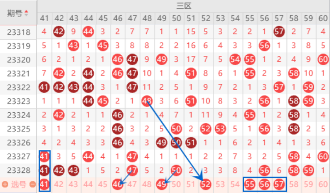 上期开出了41 42 43号数字的连号,本期我们要注意一下出重的情况,可以重点关注一下41号数字走三重的情况。本期的46号数字我们关注一下,有可能往回走的。连号52 53本期有机会落下一个号码的来的,我们要注意了。上期开出了连号空一带号56 58 59号数字,本期我们要注意一下夹号57号数字的出号情况,重号关注一下56 58号数字出重的情况。