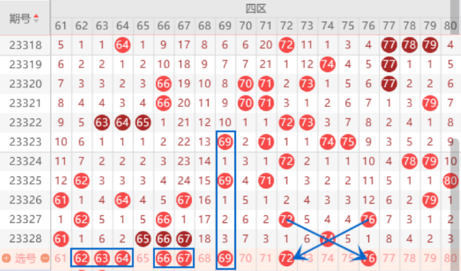 本期的62 63 64号数字我们要注意一下出号情况,62号数字是属于V型号码,出号机会是有的,63号数字是属于空三中心号,64号数字是属于斜四连号码,出号机会都有的。上期开出了的三连号65 66 67号数字本期我们也是要注意出重的情况,重点关注一下66 67号数字出重的情况。本期的69号数字我们关注一下,出号机会也是有的。本期的72 76号数字我们要注意出一个号码的情况,是属于交叉对称号码。