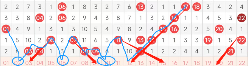 第一区间号码01-20,本区上期出现两连号,以及一个最厉害的五码斜连号,这一期关注老赫标注的蓝色标识以及红色箭头所示,上一期这里没有出现重号,要小心了。彩虹多多均线分析杀号本区有08, 14, 19, 20.