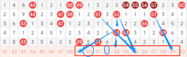 第三区间号码41-60,本区目前正处于冷区,连续四期以上,大家发现没有,但凡是出现四连以上的地方,一定会热转冷,之后经过一个周期再回热,但至少目前来看有迹象要转热了,所以我们前面讲,大家再购买快乐八的时候一定要分开区间买号码,然后再组合。彩虹多多均线分析杀号本区有36, 42, 43, 45, 49, 52, 54, 60。