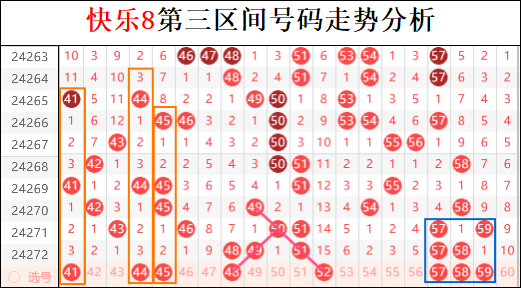二区目前走势比较明显,前半部分聚集性走势走出孤码形态应该是代表着本期走势结束。相对来说中部开始出现连码的下拉形态,对于这样的形态来说,本期应该有继续下拉的空间。但是从形态上来说,三重可能要规避,而空区部分再次开出两大板块,本期走势当中应该要考虑空降的可能性,比如大连码在本期当中能否再次出现在二区。对于区间回调之后,作为最少号码的区间来说,我觉得二区还是有不错的机会的。不过主线当中我们认为按照快乐8聚集走势,依然在上一期的连码部分做中路号码的布局是本期最佳的布局点。