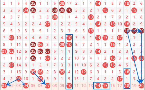 该区间的01 04 07号数字我们要注意了,它们是属于1路号码,已经遗漏3期了,本期是有机会出号的,07号数字走势太好,可以做一下防守的。本期的10号数字我们也是要注意一下,他是属于重号回补号码,出号机会还是有的。本期的14 15在其他走势图上是一样的走势,我们要注意一下这里出现一个号码的情况。本期的20号数字我们做一下防守就行了。可以关注一下18号数字的出号情况。