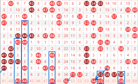 本期的44号数字是属于131走势,我们要关注一下,出号机会还是有的。本期的48号数字是属于空一对称号码,我们要注意出号情况。上期开出了4连号55 56 57 58号数字,本期这里我们要注意出现2个重号的情况,重点关注一下55 56 58的出重的情况。连号59 60号数字我们本期也是要注意落下号码的情况的。