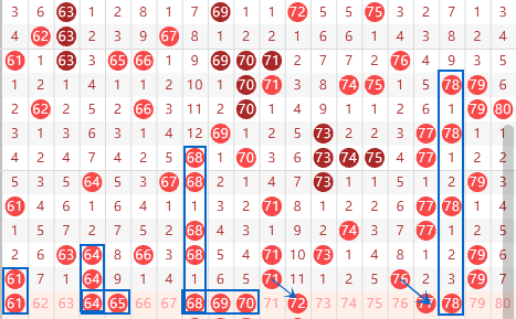 本期的64号数字我们要注意走三重的情况,65号数字是属于遗漏9期的号码,本期遗漏9期的号码有2个,而且已经有4期没有出号了,本期我们要注意一下出一个号码的情况,所以这里我们要注意64 65同出的情况。本期的68 69 70号数字我们要注意了,这里有可能会出连号的,注意68 69同出或者69 70同出的情况。该区间的72 75 78号数字我们要注意一下,出现一个号码的情况还有的,我们要注意了。