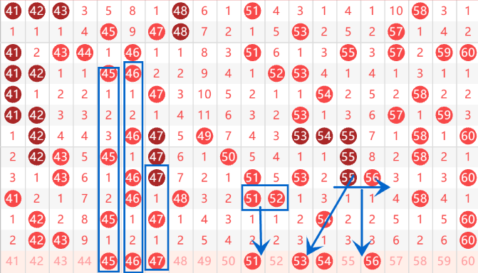 下图为41-60号数字区间走势分析图: