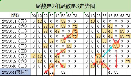 尾数2和3的走势:尾数2可以看到10期的走势几乎都是同期连号,隔期斜开二连号走势,