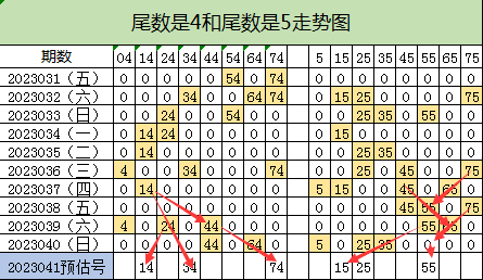 尾数4和5的走势:尾数4上期开出2个号码,一个重号,这个尾数近10期的号码