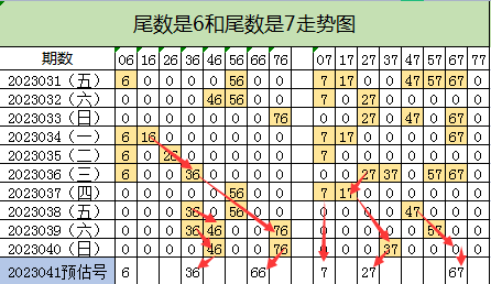 尾数6和7的走势:尾数6可以看到,近10喜欢不间断斜开走势,什么叫不间断斜开?