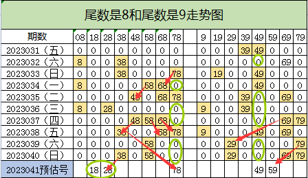 尾数8和9的走势:尾数8首先可以看到号码78在本期走势上不仅有斜开走势,最为明显的是空期走势,