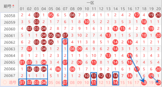 该区间的02 03 04号数字我们注意一下出一个号码的情况,其中的03 04号数字可以重点关注一下。本期的07 09号数字是属于交叉对称号码,出号机会也是有的,我们注意一下07号数字出号情况。上期开出了10 11 12 13 14 号数字的五连号,本期我们注意一下出重号的情况,其中的11 14号数字可以重点关注一下出重号的情况。本期的18号数字是属于三斜连号码,出号机会是有的,我们可以关注一下18 20号数字同出的情况。