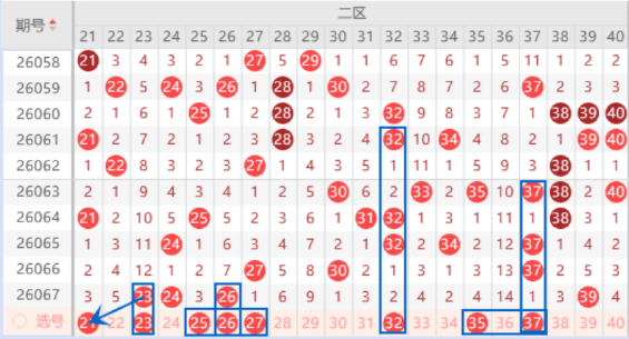该区间的21号数字我们防守一下出号情况,本期可以防守一下21 27号数字同出的情况。上期开出了23 24 26号数字,本期我们注意一下出重号的情况期,其中的23号数字可以重点关注一下出号情况,夹号25号数字我们也是要关注一下出号情况的。本期的32号数字是属于对称号码,出号机会也是有的,本期可以防守一下31 32号数字同出的情况。本期的37号数字是属于空一对称号码,出号机会是有的,本期可以防守一下35 37号数字同出的情况。