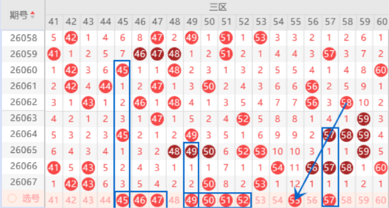 该区间的45 46 47号数字我们注意一下出号情况,其中的45 46号数字可以重点关注一下,也可以防守一下同出的情况。本期的49号数字是属于252走势,出号机会也是有的,我们可以防守一下49 50号数字同出的情况。本期的51 52号数字我们注意一下出一个号码的情况,其中的51号数字可以重点关注一下。三连号56 57 58号数字上期没能开出重号来,本期的55 56 57我们就要注意出一个号码的情况期,其中的55 57号数字可以重点关注一下出号情况。