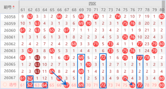 该区间上期开出了61 62号数字,本期我们注意一下出一个重号的情况,其中的62号数字我们可以重点关注一下出号情况。本期的67号数字是属于空三对称号码,出号机会是有的,我们可以重点关注一下。本期的69号数字是属于空一对称号码,出号机会也是有的,我们可以防守一下67 69号数字同出的情况。本期的72号数字出号机会也是有的,我们可以防守一下72 80号数字同出的情况。上期开出了75号数字,本期我们注意一下走分边的情况,所以本期的74 76号数字我们可以关注一下出一个号码的情况。