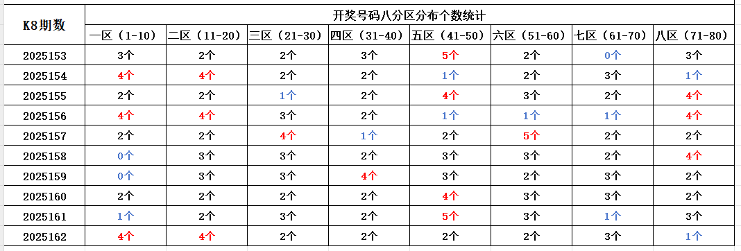 如图,红色字体是热号区,区间开出4个及以上号码。蓝色字体是冷号区,区间开出1个及以下号码。以近10期为一个分析周期,依据久热必冷,久冷必热的规律,本期重点关注:一区、二区、五区,区间可能开出3-4个号码。七区、八区,区间可能开出1-2个号码。个人分析,仅供参考。
