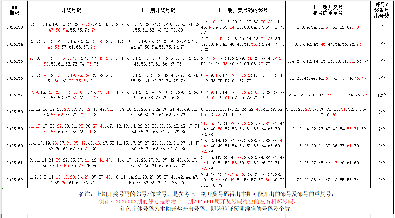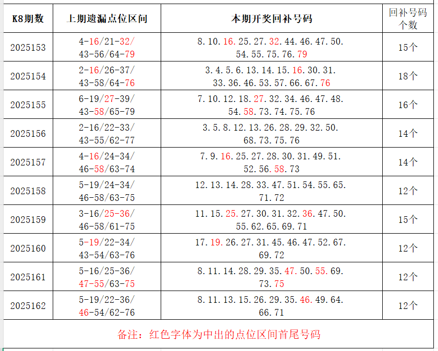 如图,上期的遗漏号码在下期开出10个左右,即为回补号码。定准点位区间首尾号码是关键!以上期2025162期(会员专区数据)为例,定位4个遗漏区间,围中12码!结合上期开奖号码,以跨度值大于或等于7为依据,本期关注3个遗漏区间:37-46/49-59/71-80;重点关注遗漏-区间:****(会员专区可见),区间遗漏号码可能在本期回补开出。注意区分遗漏区间回补号码和大底号码,不要混淆。个人分析,仅供参考。