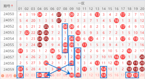该区间上期开出了01 07号数字,本期我们要注意出一个重号的情况,重点关注一下01号数字走重的情况。本期的04号数字是属于三斜连号码,出号机会还是有的,我们要关注一下。本期的05 09号数字是属于交叉对称号码,本期关注一下出号情况。本期的10号数字我们也是要注意一下出号情况的,08空二重号,09空二重号,那么10号数字的空二重号也是有机会出的。上期11 14号数字同出,那么本期我们也是要注意出一个重号的。上期的18 19 20号数字都开出重号了,本期我们要注意出一个三重号的情况。