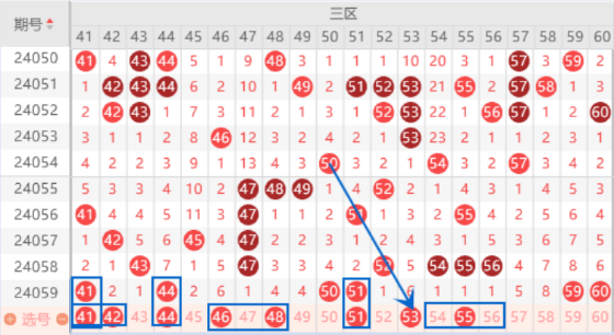 上期开出了41 44号数字,本期我们注意一下出重的情况,这里可以定一胆码出来的。本期的46 47 48号数字我们注意一下出一个号码的情况,可以重点关注一下46 48号数字出号情况。本期的53号数字是属于4斜连号码,出号机会还是有的,我们要注意防守一下。三斜连54 55 56号数字本期我们注意一下落下一个号码的情况,重点关注一下54 55号数字的落号情况就行了。