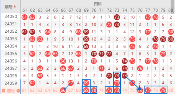 该区间的66号数字我们注意一下,毕竟上期开出了50号数字,有可能会把66号数字带出来的。上期开出了67 69号数字,本期我们注意一下出一个重号的情况。重点关注一下69号数字走重的情况。本期的73号数字我们注意一下出现三重的情况,可以防守一下64 73 76号数字同出的情况。本期的77号数字是属于空三对称号码,我们可以关注一下出号情况的。