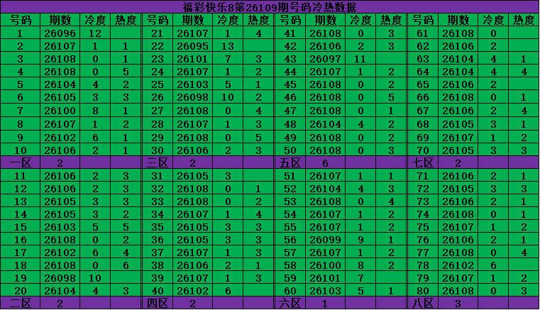 首先把福彩快乐8是从01-80个号码中每期开出20个号码,我们把80个号码分为四个区:一区01-10号,二区11-20号,三区21-30号,四区31-40号,五区41-50号,六区51-60号,七区61-70号,八区71-80号;从上期开出数据选出大底号!