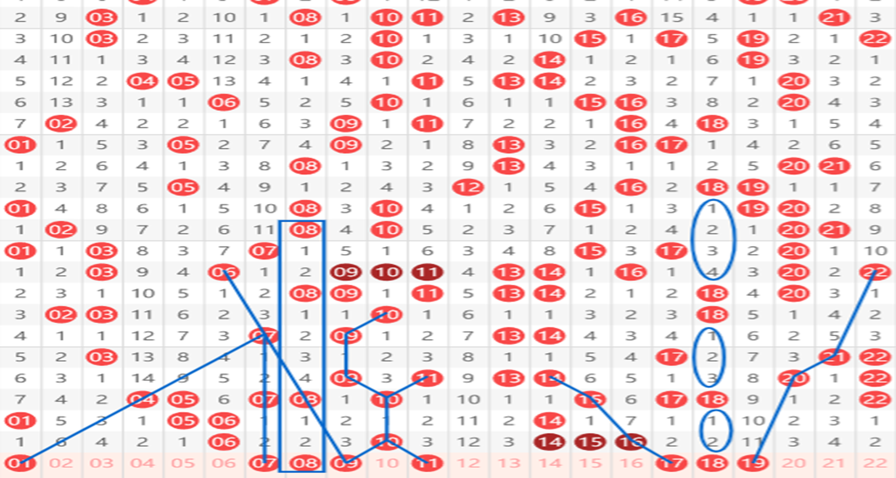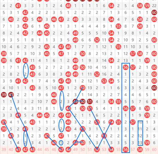 快乐8第2025281期41-60区域的推荐如上图,这个区域我们考虑与斜连号码居多。首先看39~41的三斜连,然后是40~43的间隔对称斜连,还有42的上下间隔二对称走势,以及45~47的三斜连。同时47又是一个间隔,3-2-1的间隔递减走势。旁边的48考虑同时开出。再往过来我们就看到了48~52的间隔而斜连以及旁边54~52的间隔一斜连。再往后就是54号的一个间隔一四斜连,还有56号的上下对称的间隔五对称.以及58号13期的大遗漏,这期大家防一防他开出。具体请根据个人思路选择。