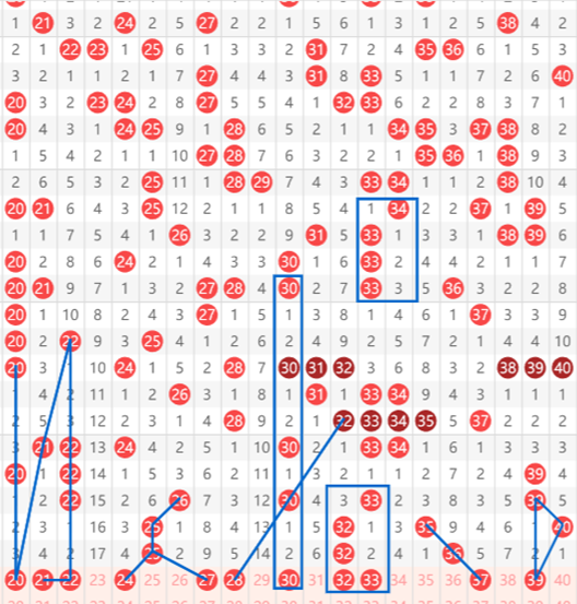 快乐8第2025281期21-40区域,这个区域首先我们看20号的间隔三对称,以及我们看22号间隔三期出了2122,然后再往下出现有可能开出的20.21.22这三个号码,然后24号的我们考虑到是26,开出两个25,然后再给出一个24的麻花走势。27和28参照上面的走势,特别是28号,从32号间隔了两期出30,再间隔两期出28的间隔2走势。30号我们看到了是一个上下对称的间隔2走势。32号本期考虑走重。带出33号形成一个完美的走势。37号是一个傻瓜号,35-36-37的三斜连,39号我们看到的是一个经典的三角夹脚走势。具体请根据个人思路选择